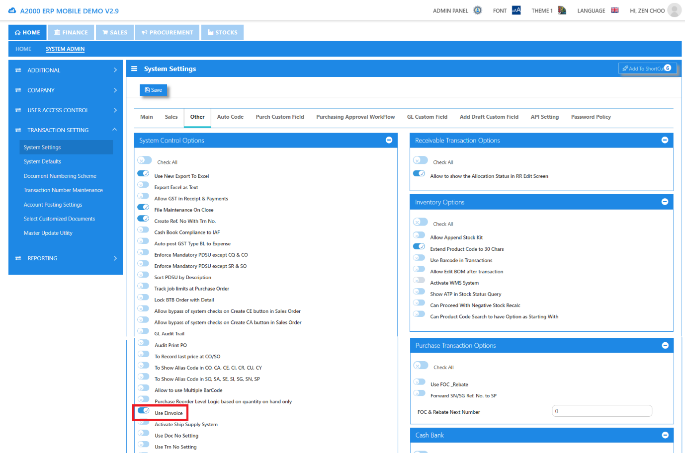 1. Activate “Use Einvoice” under HOME > System Admin > System Settings > Tab: Others