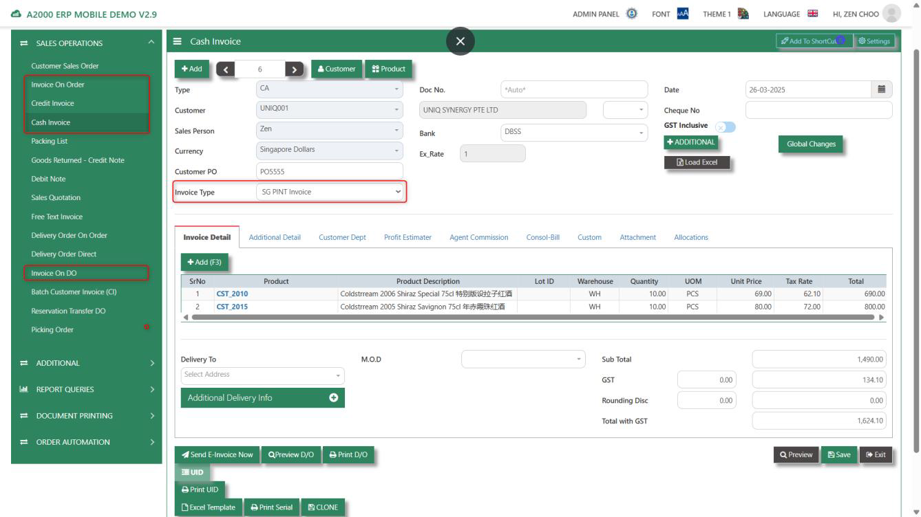 You can send the Invoice in Invoice on Order, Credit Invoice, Cash Invoice, and Invoice on DO.