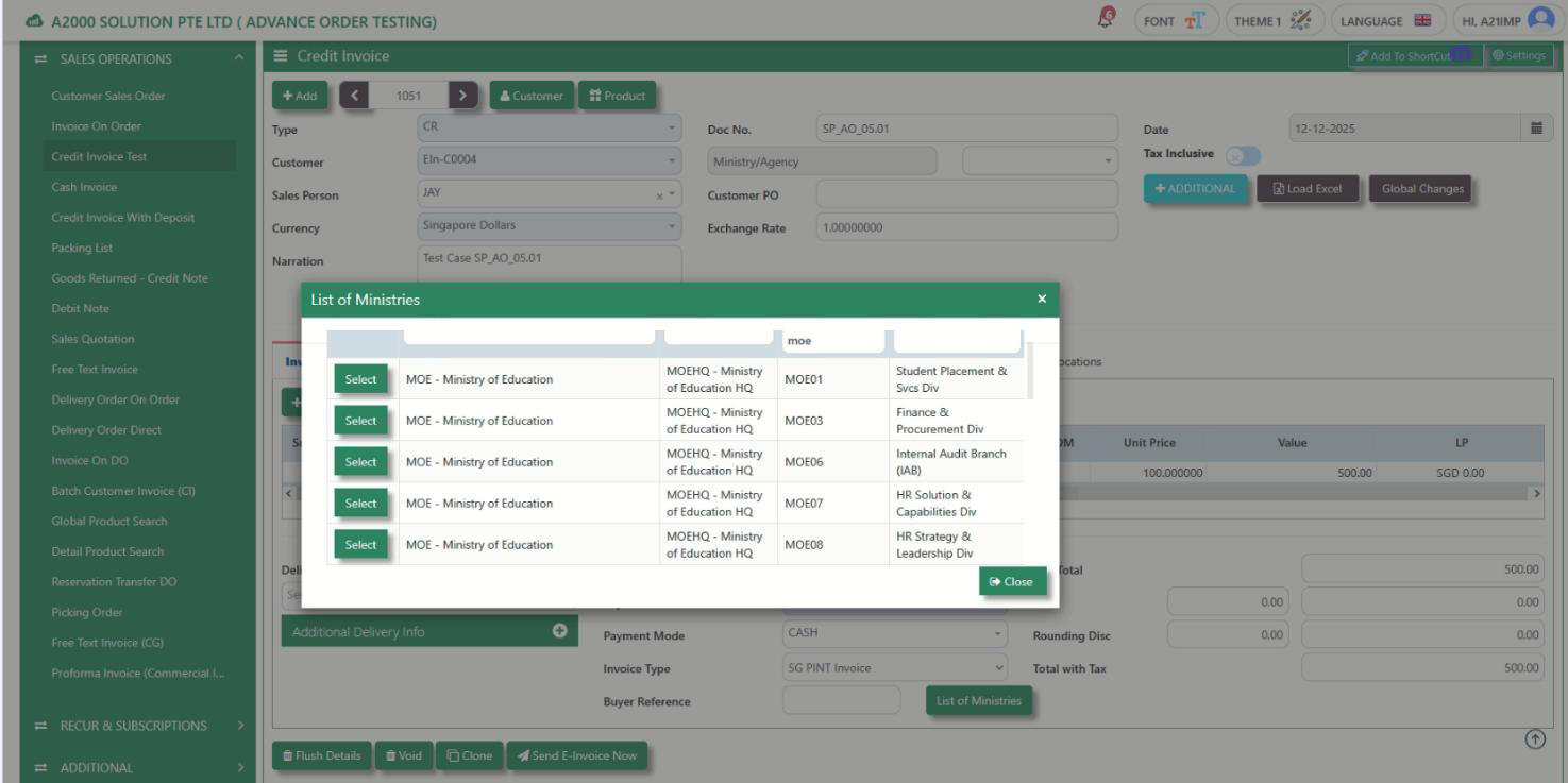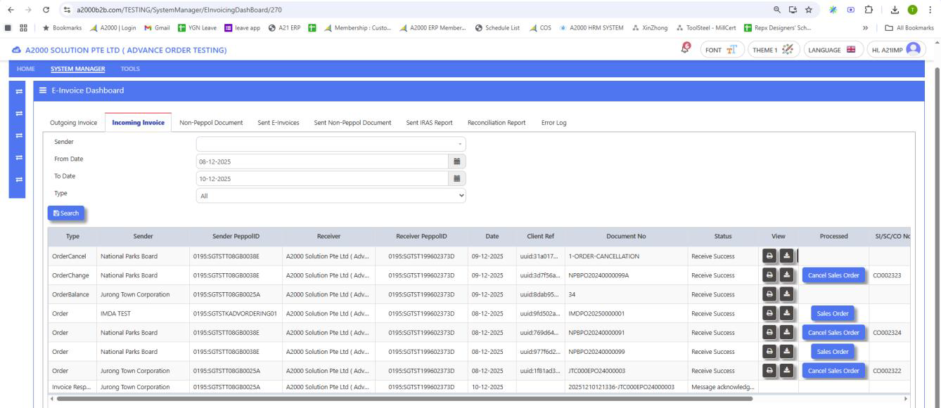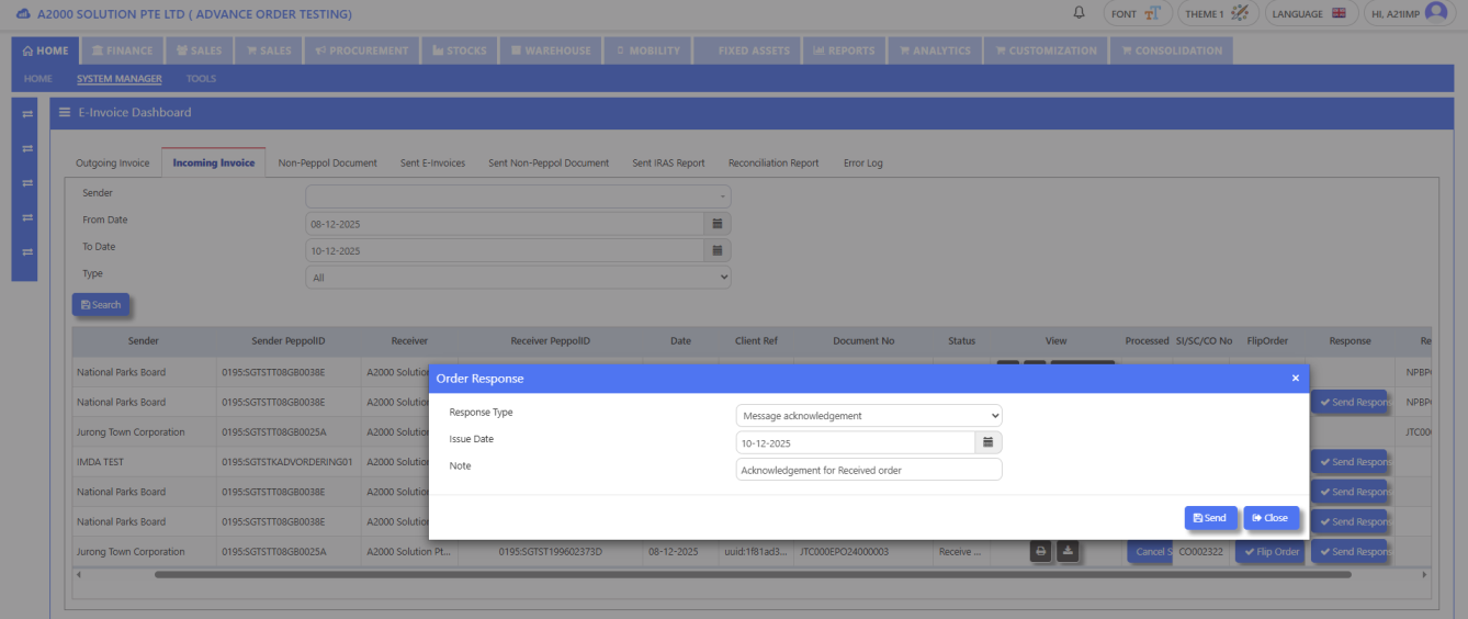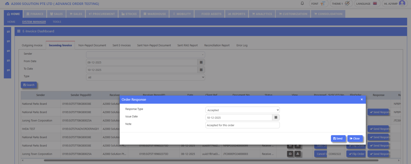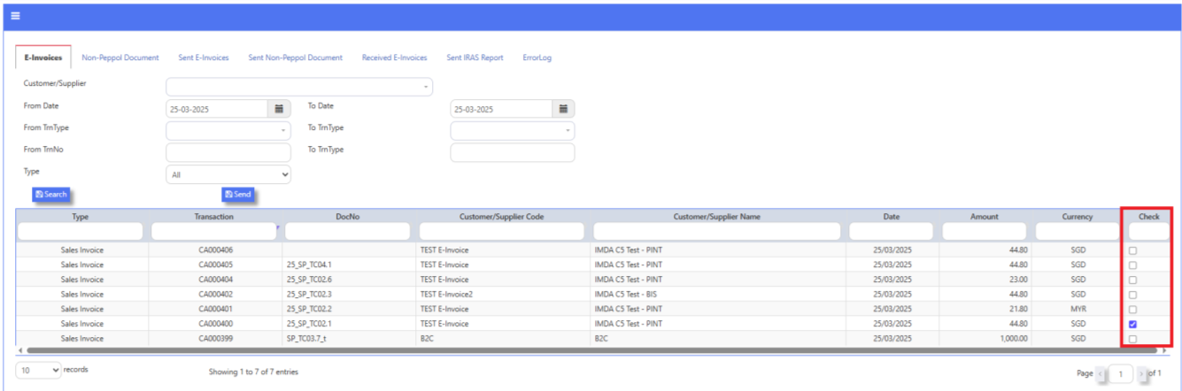• User can perform “Sales Invoice” and “Purchase Order” selection and send in batch.