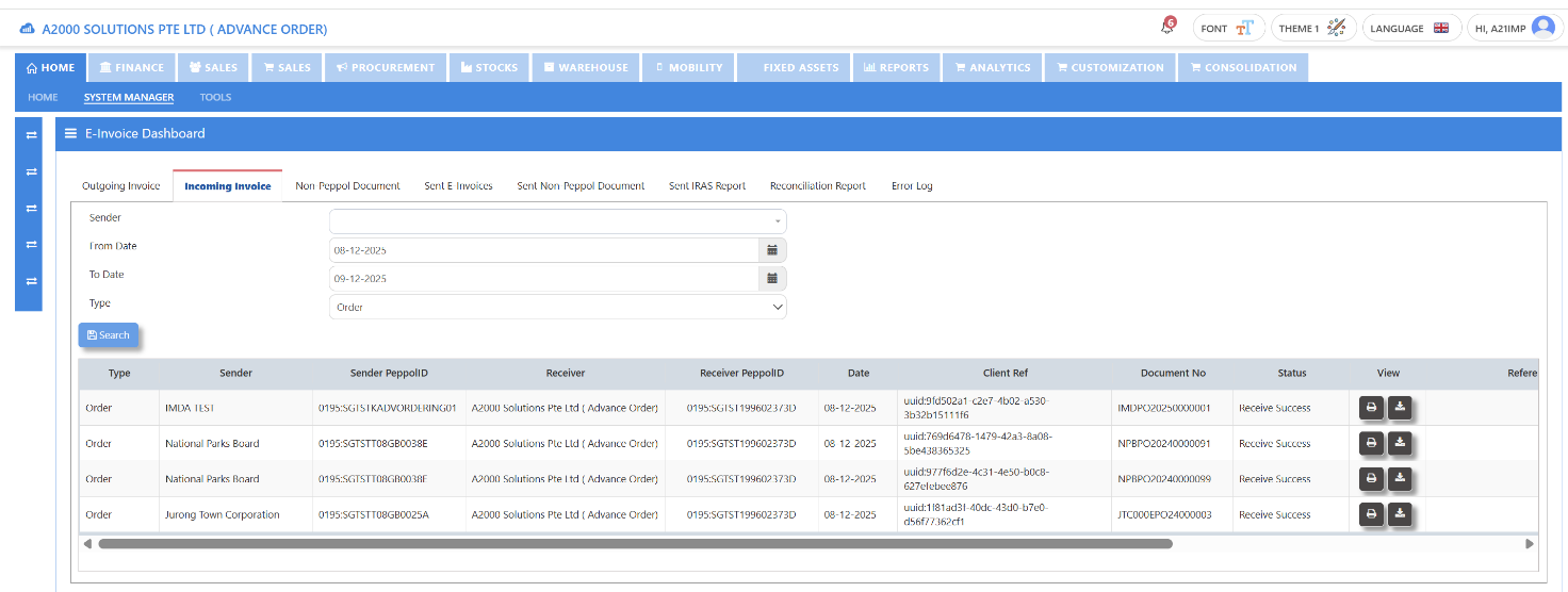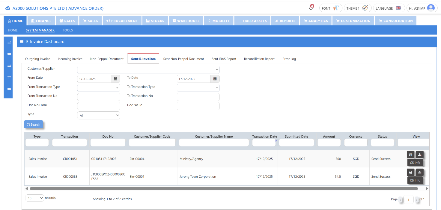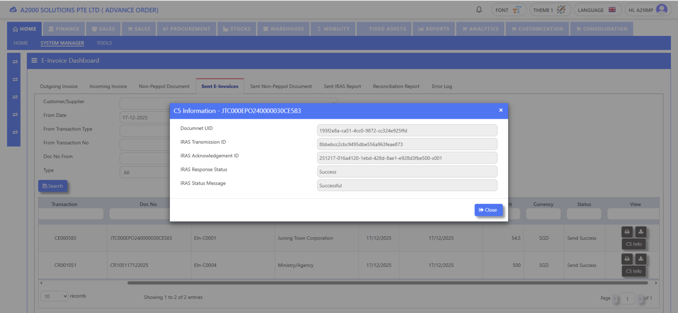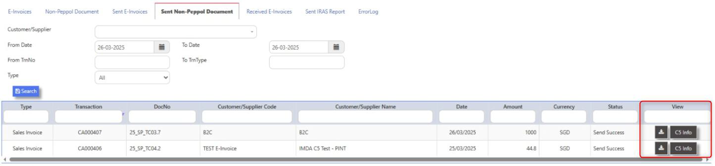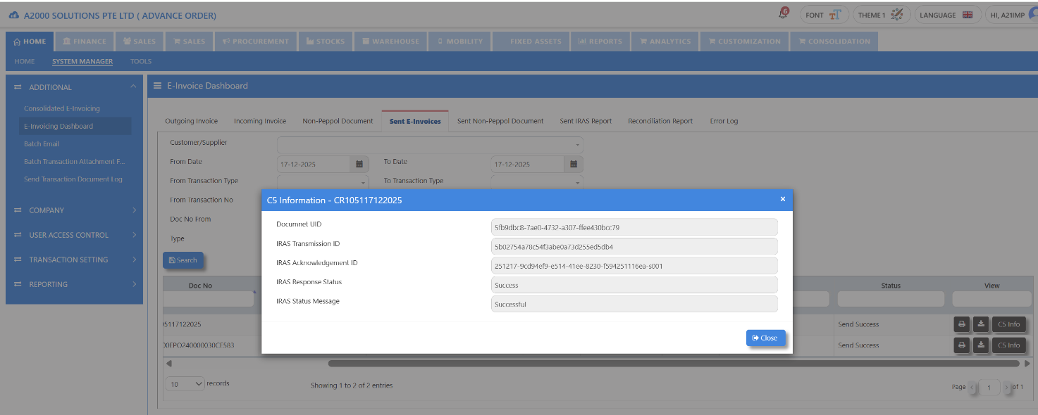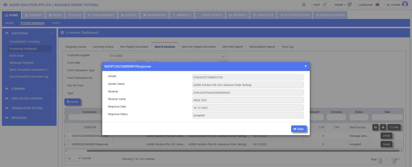 • User can view Send Status, Print/Preview Invoice, Transaction Reference No.