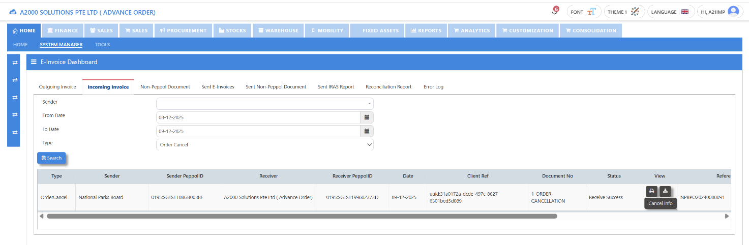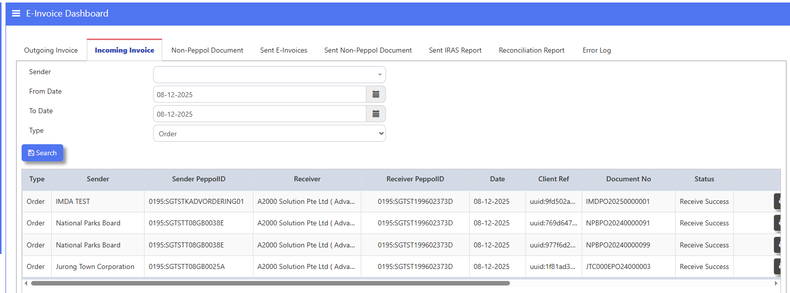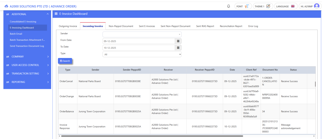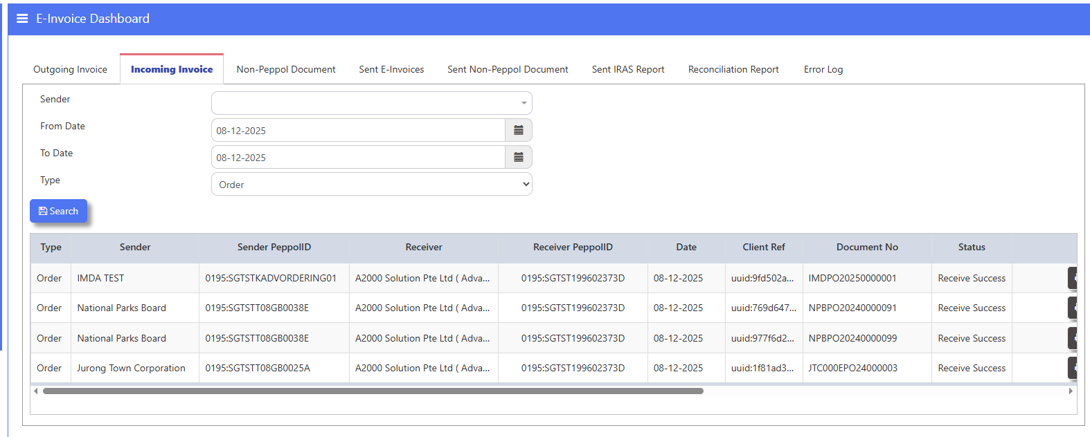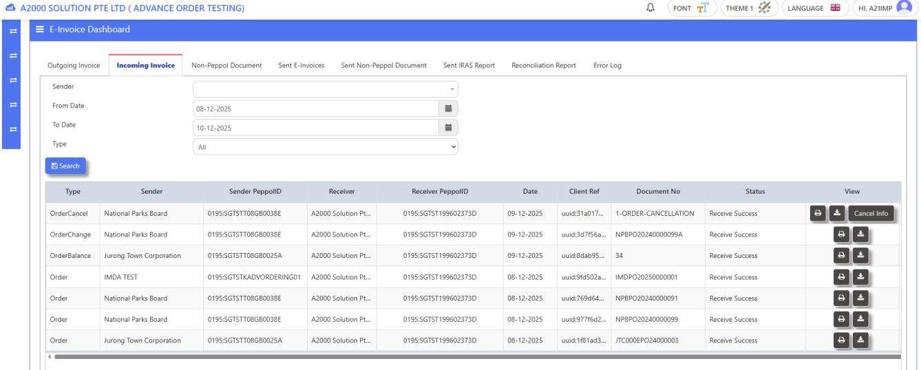 • User can view Sender and Invoice information, Status, Print/Preview Invoice, Transaction Reference No.