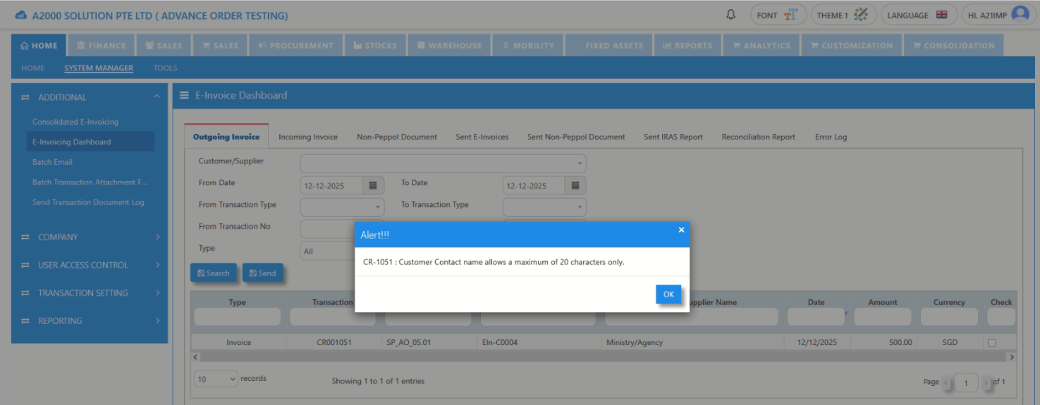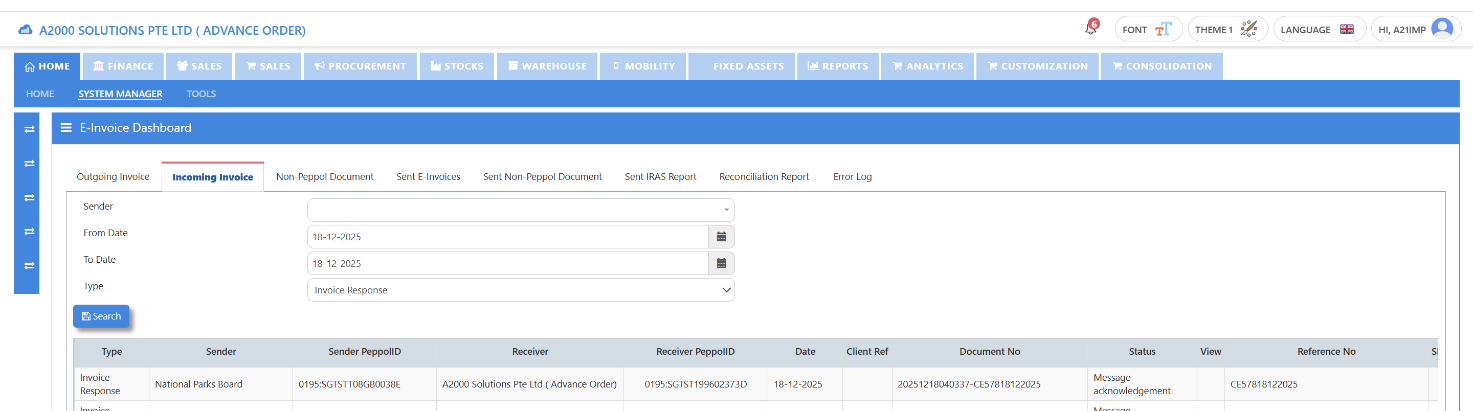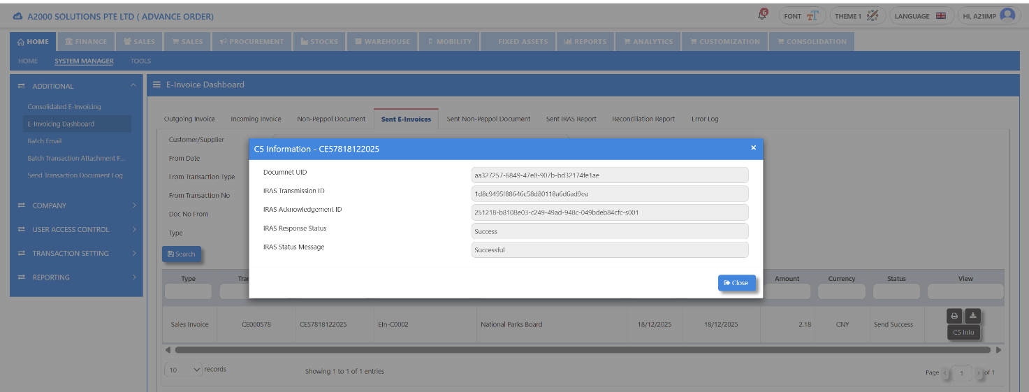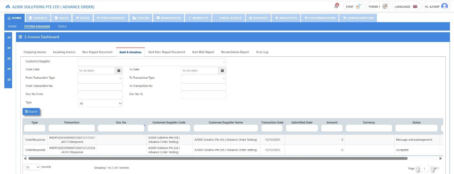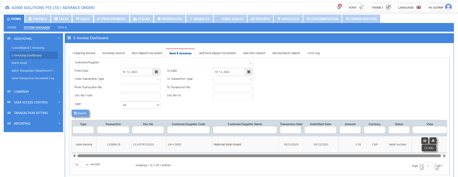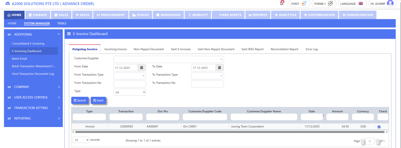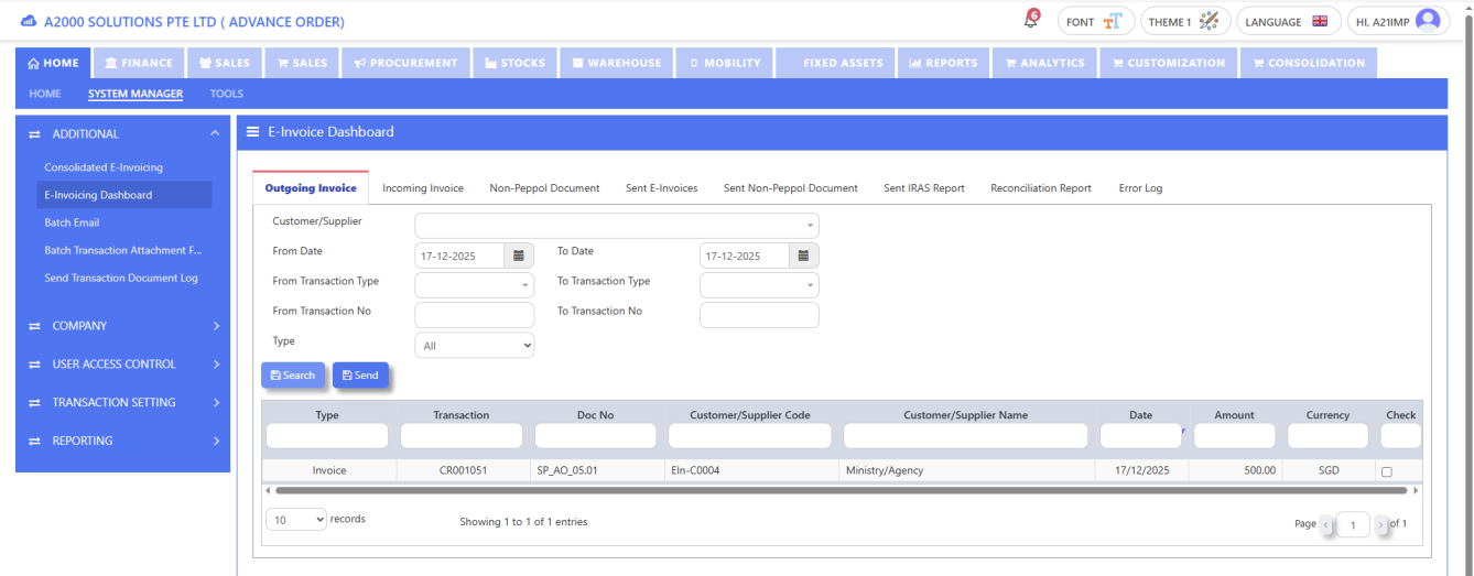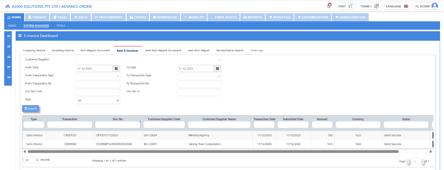 Home > System Admin (Full User Access) > Additional > E Invoicing Dashboard