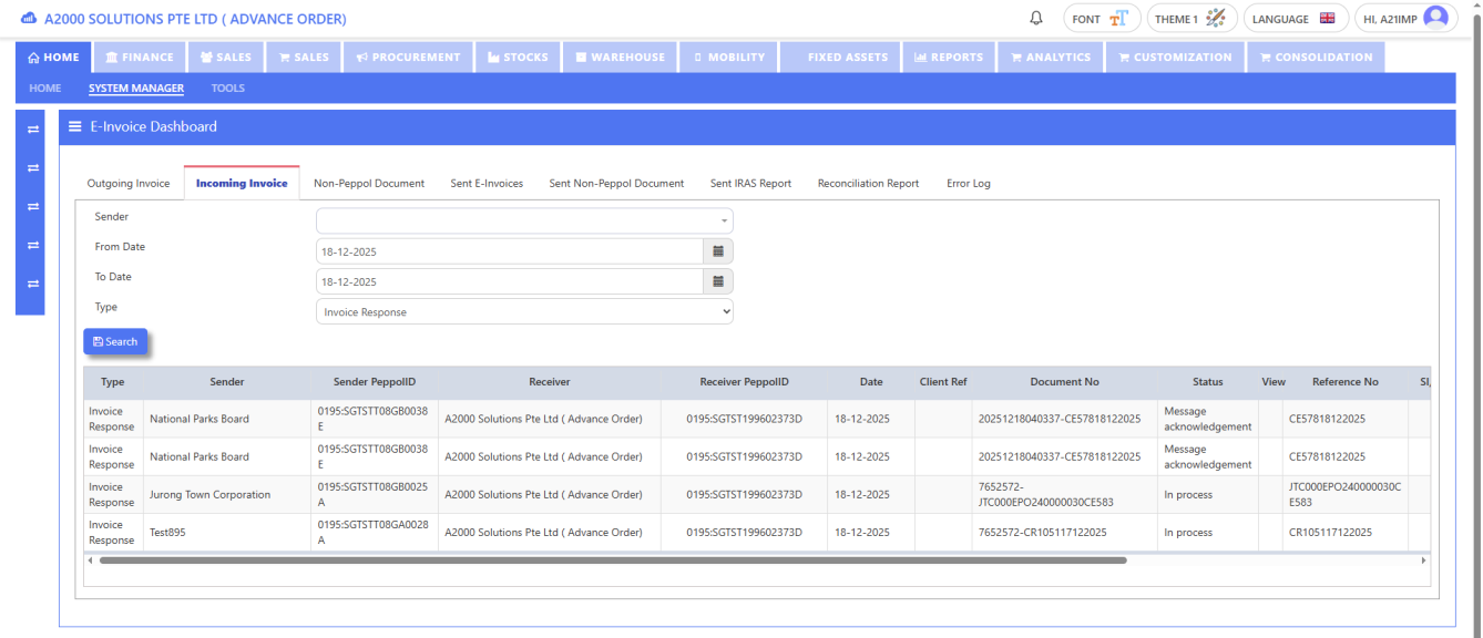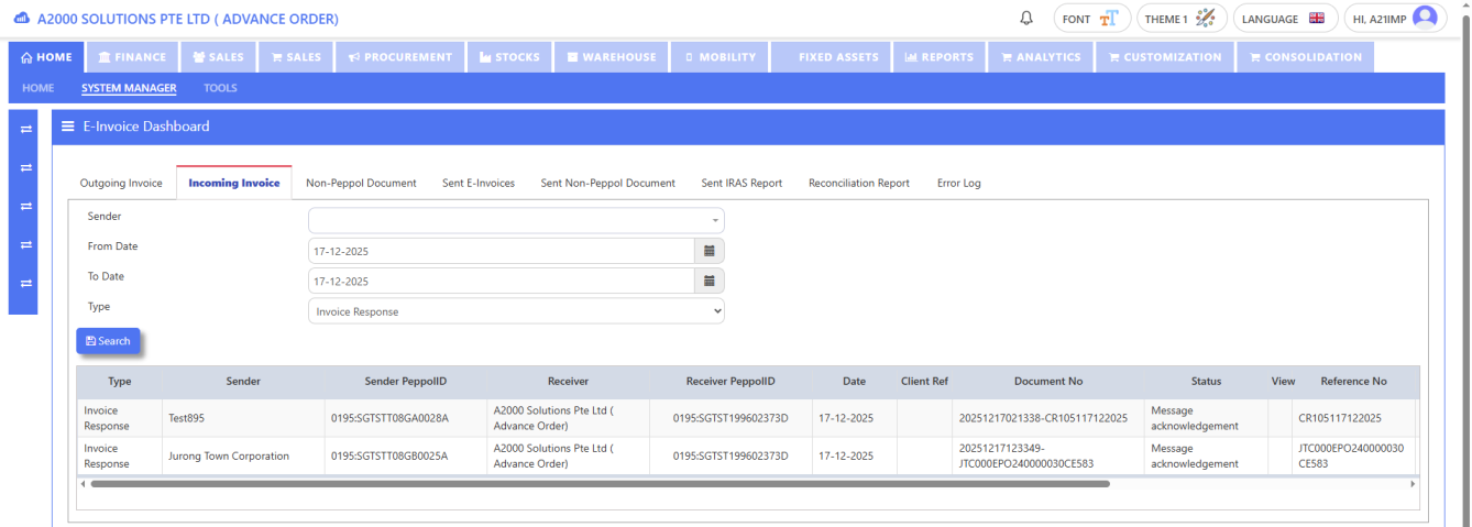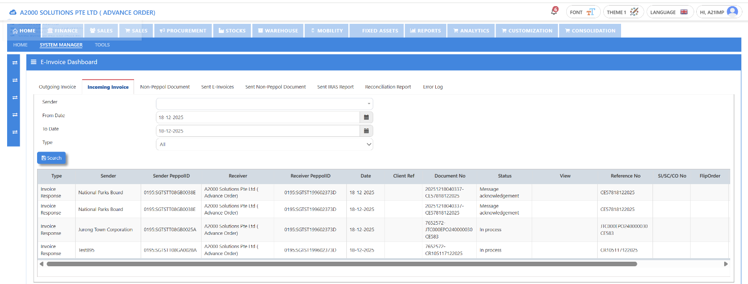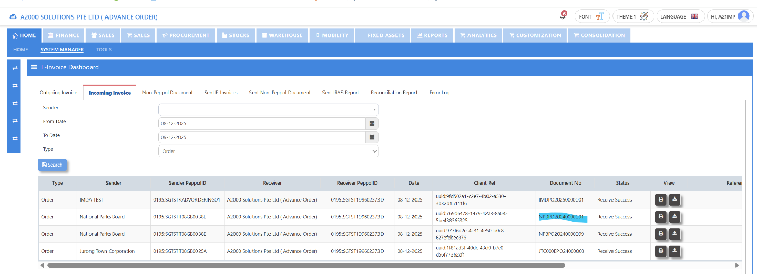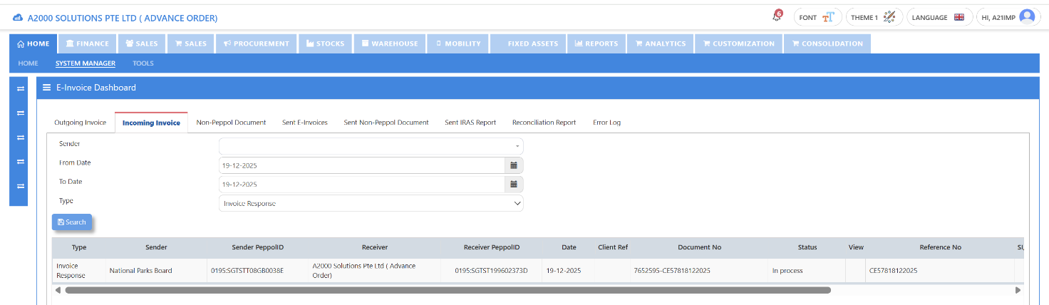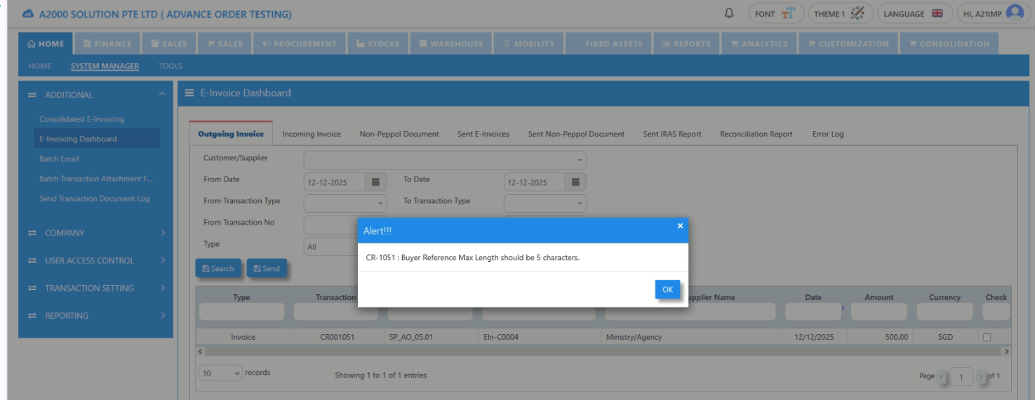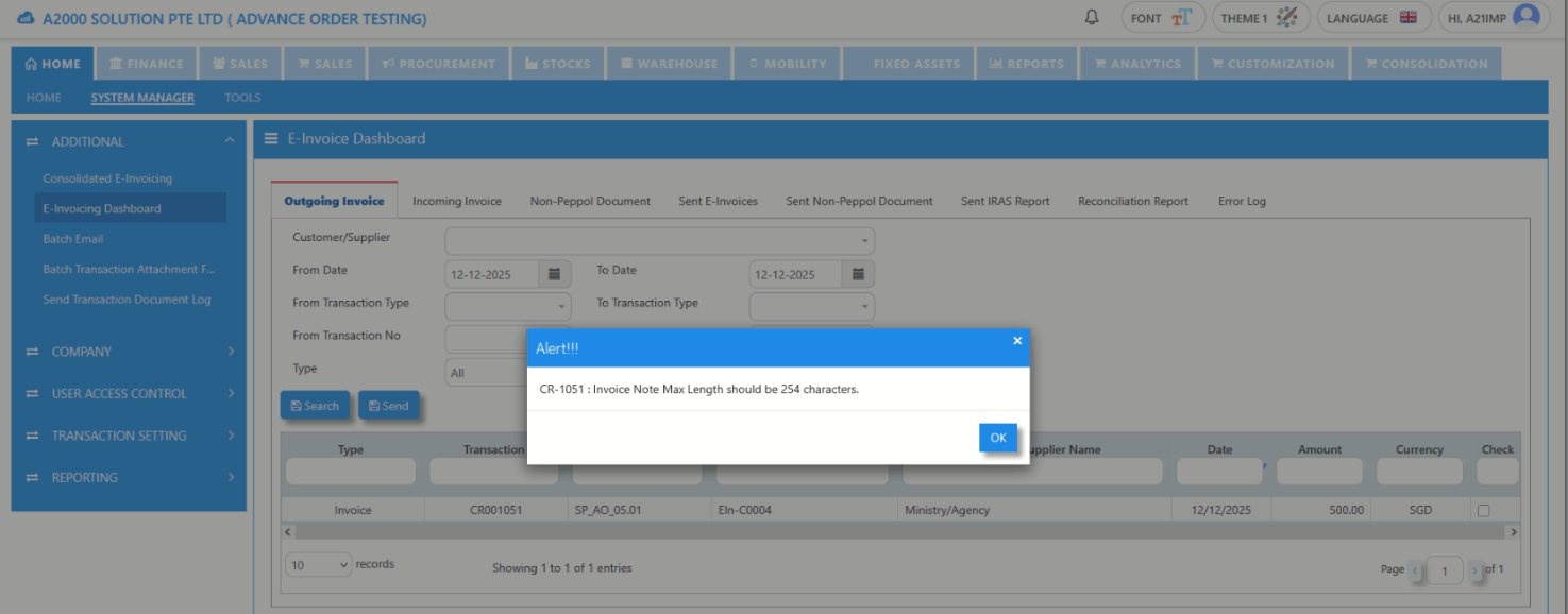 Home > System Admin (Full User Access) > Additional > E Invoicing Dashboard